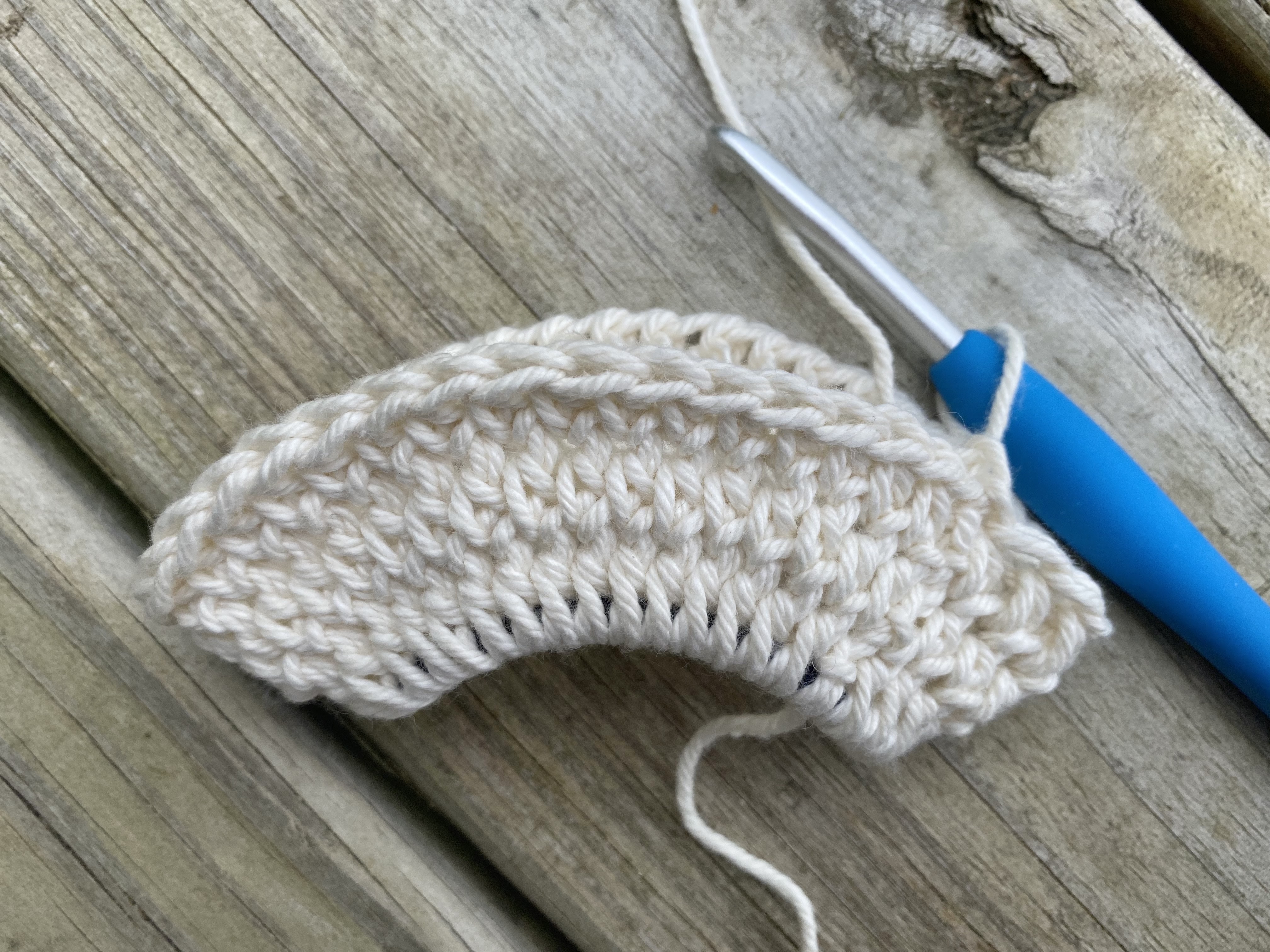 HDC in each stitch. Bag dispenser is made in one piece. Starting at the bottom attach yarn around hair tie by pulling up a loop.